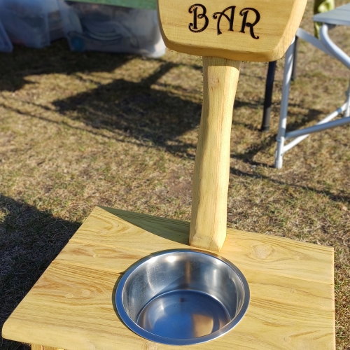 Hundebaren er lavet i robinia og kan derfor fint bruges udendørs. Som udgangspunkt er skålen i ca 12 cm højde. Men den kan laves højere hvis det ønskes. Skiltet kan laves med en anden tekst, fx hundens navn. Pris 375 kr.
