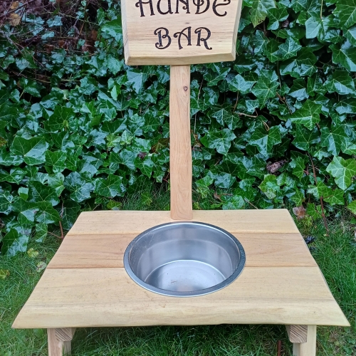 Hundebaren er lavet i robinia og kan derfor fint bruges udendørs. Som udgangspunkt er skålen i ca 12 cm højde. Men den kan laves højere hvis det ønskes. Skiltet kan laves med en anden tekst, fx hundens navn. Pris 375 kr.